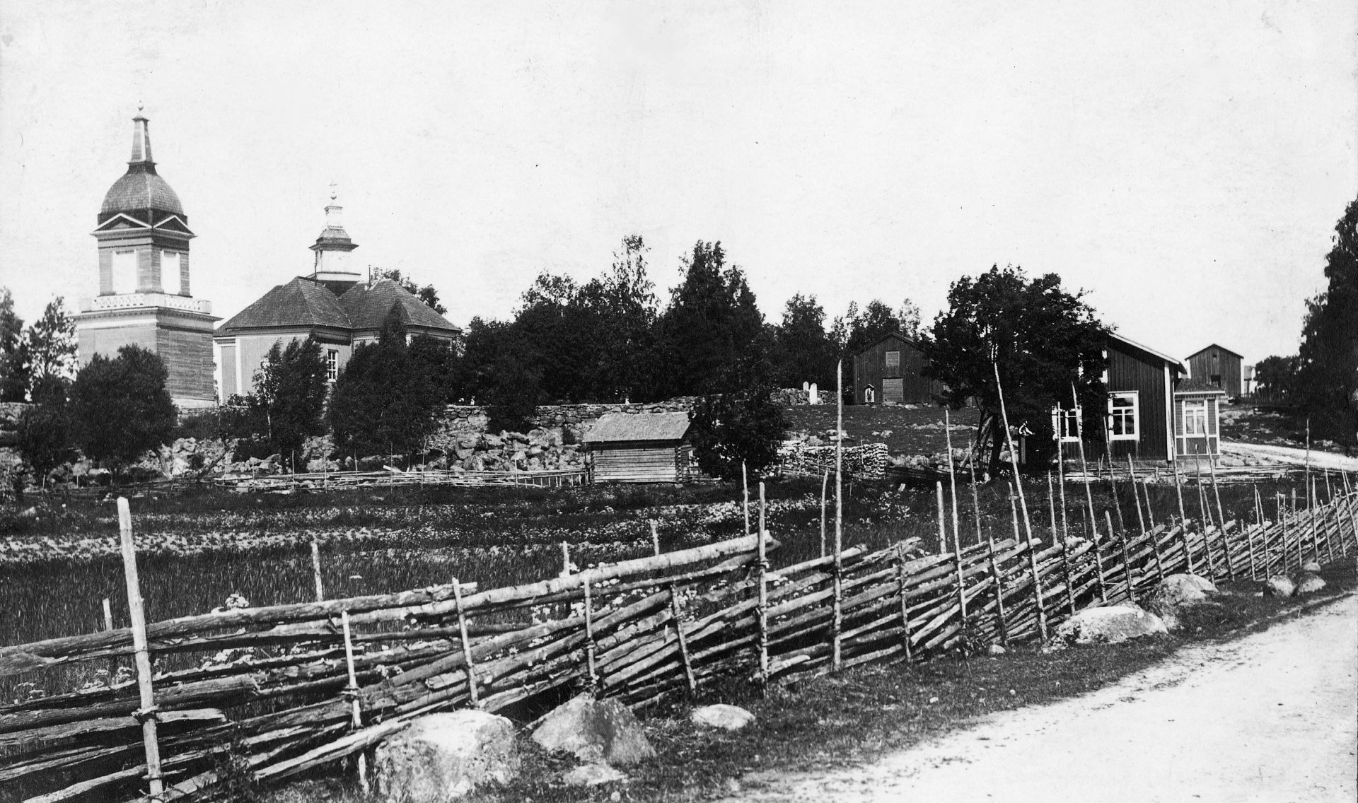 "Gamälbyin" i Petalax, med kyrkan i bakgrunden, i början av 1900-talet.